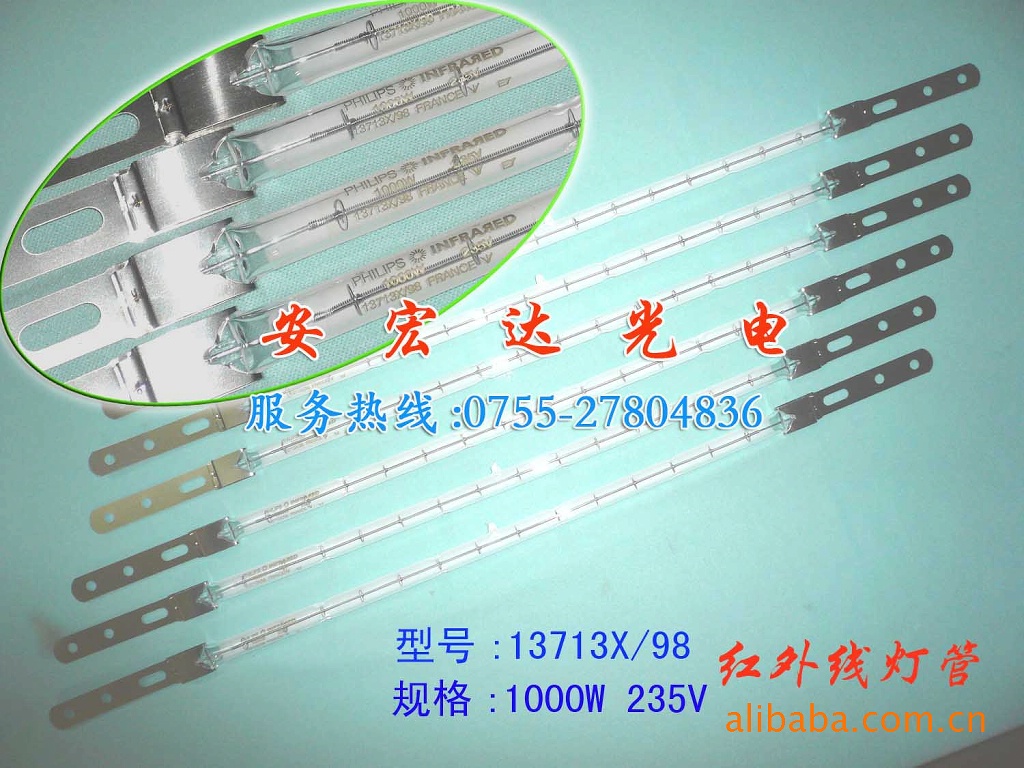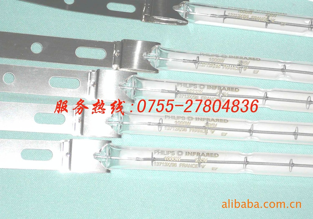 飞利浦红外线灯管13713Z/98 1KW/235V加热管 管状双端石英红外线灯是由钨丝外套石英灯管用高功率电源启动的光源。该光源属卤钨灯系列,该光源能防止灯管变黑,进而防止使用中红外线衰退。工业应用中的好处是高效,对电力控制反应灵敏,紧凑,轻。根据不同类型,点灯位置可水平或任意位置。