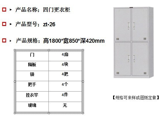 | 四门更衣柜 | 高1800*宽850*深420mm | 平面静电喷塑 | 0.5mm |