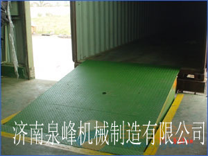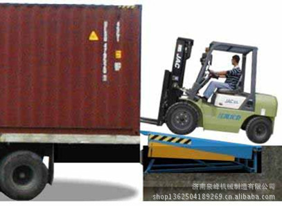 固定式登车桥一般安装在车间门口或货台上边。当需要装车或卸车式将车到至车间门口,停车后按下登车桥按钮,登车桥慢慢升起,当升到一定位置时收起的舌板会慢慢打开。这时可以松开按钮。这样登车桥就会慢慢降下搭在车上。这样叉车就可以从车间直接开到车上去,进行装卸货物。主要作用是调节不同车辆的自身高度。