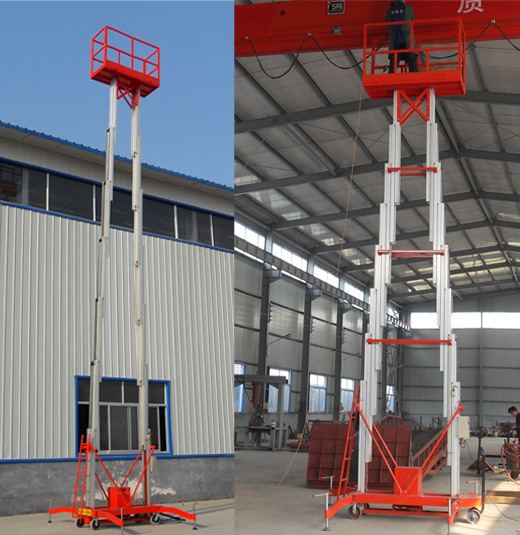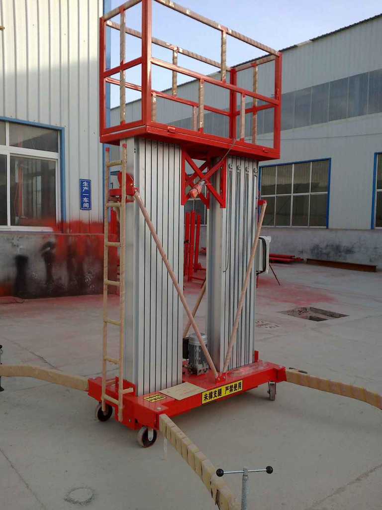 双桅柱式升降平台采用高强度优质铝合金材料,具有造型美观、体积小、重量轻、升降平衡、安全可靠等优点,广泛用于工厂、宾馆、餐厅、车站、机场影剧院、展览馆等场所,是保养机具、油漆装修、调换灯具、电器、清洁保养等用途的最佳安全伴侣。