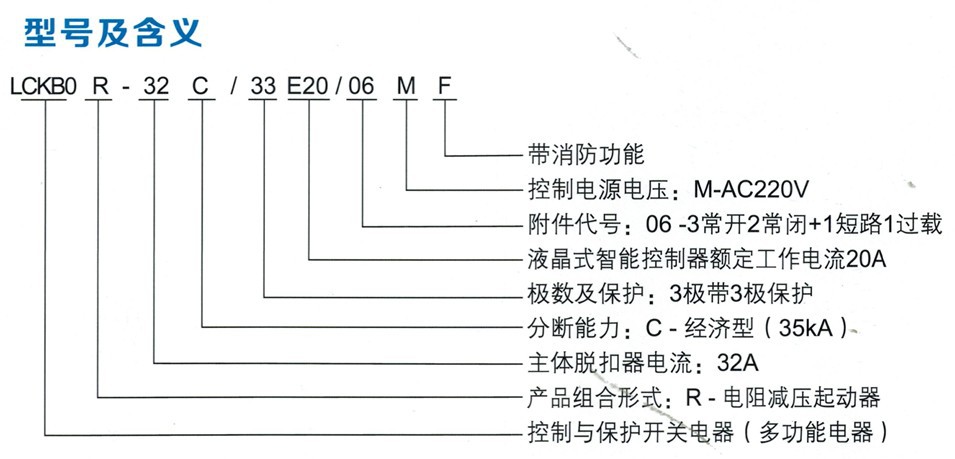 以LCKBO作为主开关,与接触器、机械联锁、电气联锁等附件组合,构成电阻减压起动器成套单元LCKBOR(以LCKBO-F消防型产品作为主开关,可构成消防型电阻减压起动器成套单元LCKBOR-F),适用于电动机电阻减压起动控制与保护。