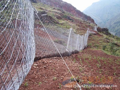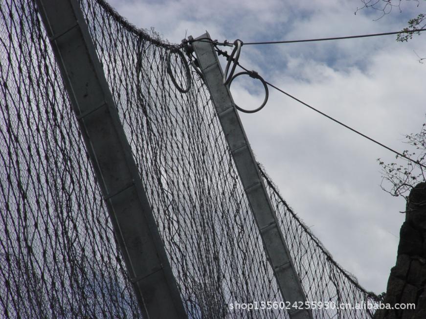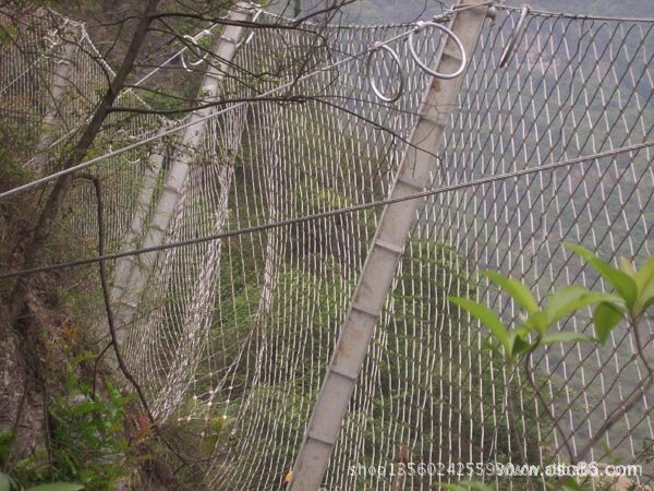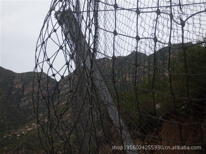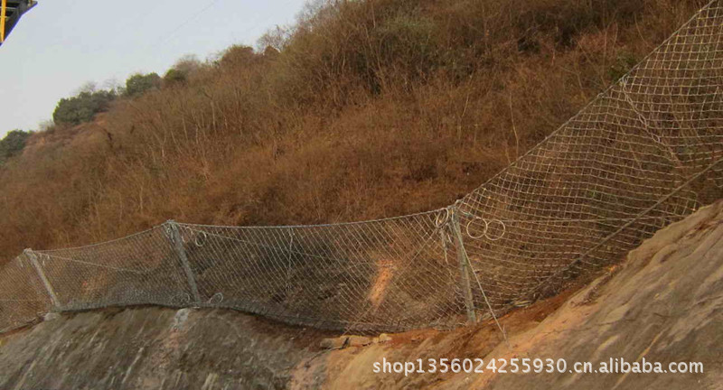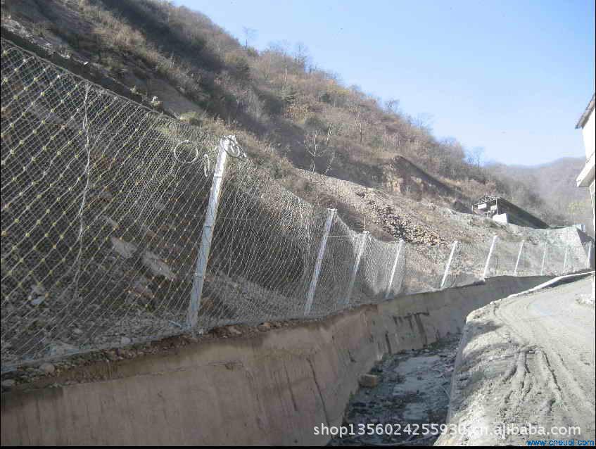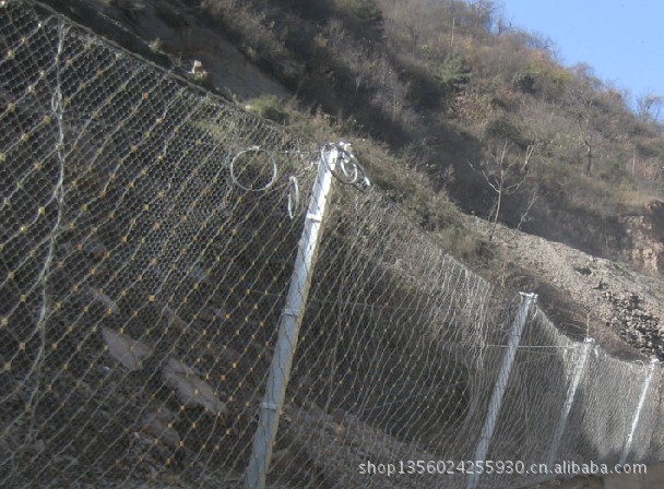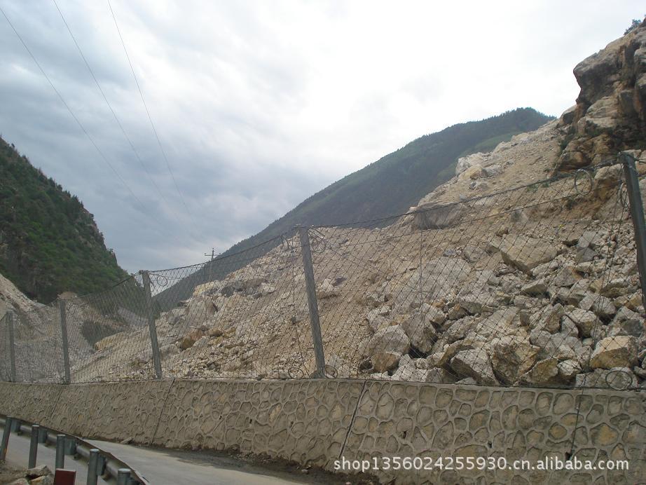 系统由钢柱和钢绳网联结组合构成一个整体,对所防护的区域形成坡面防护,从而阻止崩塌岩石的下坠,起到边坡防护的作用。被动防护网,即形式上与标准主动防护系统相似,但发挥的主要是被动防护作用。其与起加固作用的标准主动系统的主要差别在于无需进行系统锚固和预张拉来确保系统尽可能的紧贴坡面,仅通过周边和内侧局部锚固将柔性网系统自然覆盖(披挂)于坡面,甚至可仅采用上沿锚固和上沿支撑绳作为悬挂支承,形成最简单的“窗帘”式结构。既凭借系统自重覆压作用给潜在崩塌滑落体提供一定的稳定加固作用,部分限制崩塌的发生,又允许落石在系统与坡面构成的相对封闭空间内有一定限制地顺坡滚落,从而使落石在控制条件下顺坡安全向下滚落直至坡脚或坡上平台而不危及安全防护,而不是阻止崩塌的发生,它对崩塌落石发生区域集中、频率较高或坡面施工作业难度较大的高陡边坡是一种非常有效而经济的方法。它与被动防护系统相比的主要优点在于清理工作十分简便或无需清理,并避免了被动防护系统防护高度设置不足时可能发生的落石飞越,在边坡高度不太高时,该方法更为经济,且两者在一定条件下可配合应用。该系统除主要用作崩塌落石防护外,还可用作爆破飞石防护。被动防护网的型号:RX-025、RX-050、RX-075、RXI-025、RXI-050、RXI-075、RXI-100、RXI-150、RXI-200、AX-015、AX-030 、CX-030、CX-050、CXI-030、CXI-050等;被动防护网|被动防护网被动防护网|rx-025被动防护网|rx-050被动防护网|rx-075被动防护网|rx-100被动防护网|rx-025型被动防护网|rx-050型被动防护网|rx-075型被动防护网|rx-100型被动防护网|被动防护网|被动防护网|被动防护网河北蓝强金属丝网制造有限公司