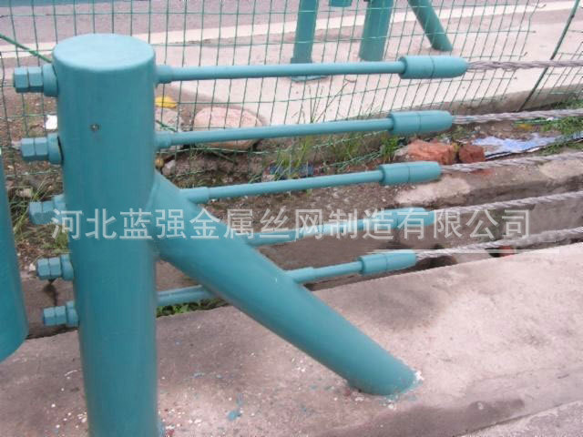 和路基填土不能保证立柱埋置深度的地方采用混凝土基础的办法。路侧缆索护栏的防撞等级是指一定质量的车辆,以规定的碰撞速度和碰撞角度作用于路侧缆索护栏时产生的碰撞能量的量度。路侧缆索护栏可分为A、s两级。确定各级缆索护栏适用范围的主要依据是各级公路的设计速度。不同的碰撞速度产生不同的碰撞能量。一般情况下,公路上的车辆平均运行速度行驶,这种平均运行速度可以按设计速度的80%考虑。在一旦发生偏离车道等偶然事故时,驾驶人员还可采取刹车、转向、松油门减速等紧急补救措施,因此,碰撞速度町按平均运行速度的80%考虑。S级属加强型、碰撞速度按80km/h考虑。 考虑到车辆碰撞缆索时产生的最大位移应满足规定值(1loom)。A级采用5根缆索,S级采用6根缆索。A级和s级缆索的初张力采用201d~,缆索采用具有较高强度和抗腐性能优良的3x7镀锌/右拧构造。五索六索缆索护栏,五索六索缆索护栏厂,五索六索缆索护栏厂家,五索六索缆索护栏规格,五索六索缆索护栏型号,五索六索缆索护栏供应商河北蓝强金属丝网制造有限公司