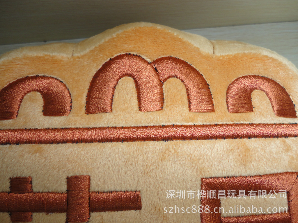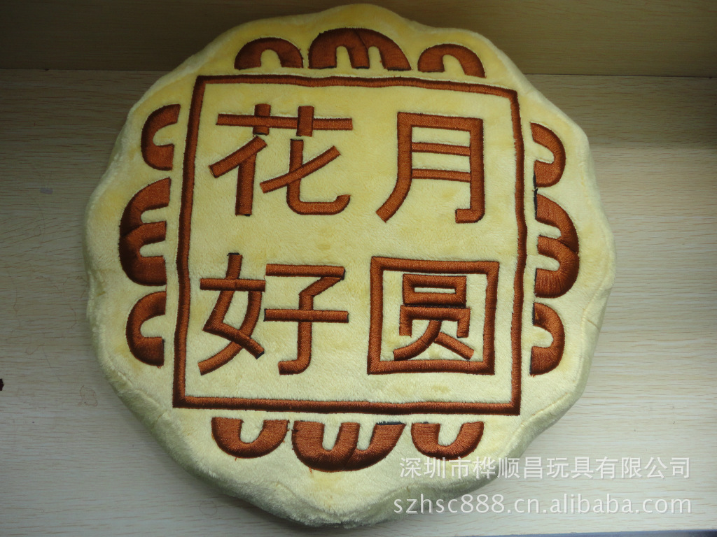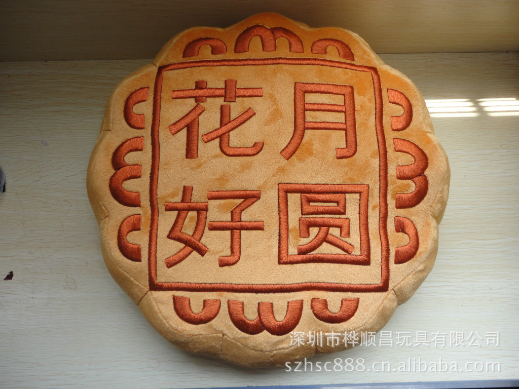 这款月饼型的抱枕,做工精细,布料柔软,绣花精美,寓意吉祥,大小适中,款式新颖。欢迎批发采购!