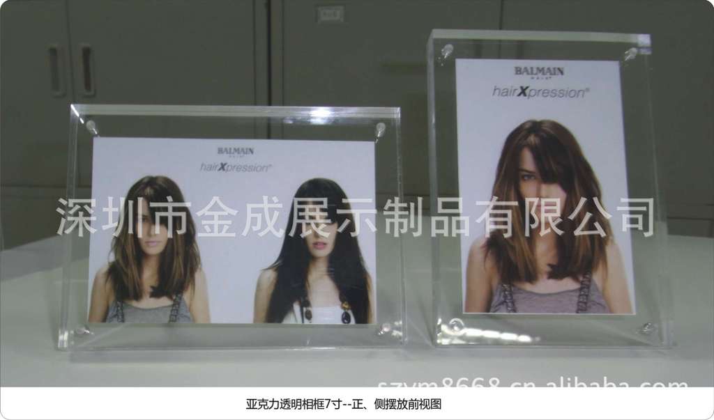产品特点:高精度激光切割,侧面抛光。两块亚克力通过2对强力小磁铁吸合,分开即可放置相片;镀镍螺丝钉撑脚,可横竖摆放。