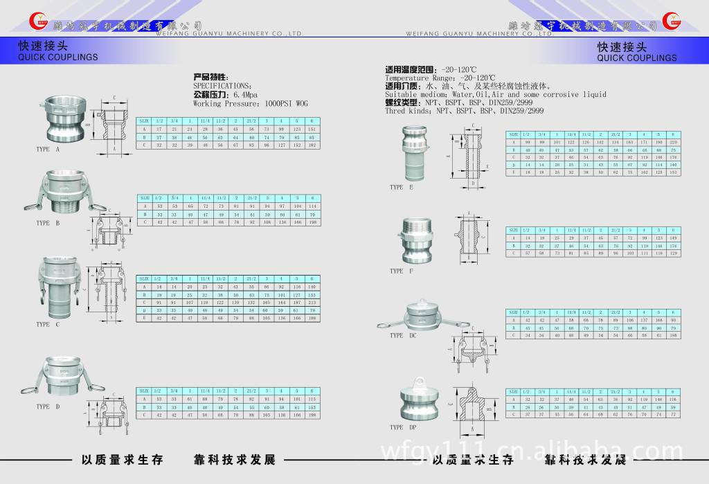 型号B、C、D、DC可以与型号A、E、F、DP任意一种组装成一套快速接头产品使用,反之亦然。用户可根椐自已具体使用需要来选择产品。与螺纹连接时,螺纹部分宜添加密封物;与软管连接时,宜用喉箍卡紧,以保证连接的密封性。快速接头主要分304 (CF8)316(CF8M)材质 快速接头模具分重型快速接头,轻型快速接头,最轻型快速接头。不锈钢快速接头任意组合,可任意组合成一端内螺纹,一端外螺纹;两端都是接管;一端外螺纹,一端内螺纹;或是任意堵塞。
