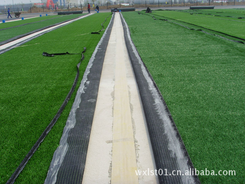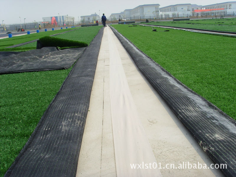 人造草坪基础可分为三种材质的基础:水泥混凝土基础、沥青基础及三七灰土基础。 方案一.水泥混凝土基础 1.平整度:平整度合格率在95%以上,5米直尺误差3mm。 2.坡 度:中心场地3‰—4‰,龟背式排水设计。弯道8‰,直道5‰,半圆区5‰,表面应平坦、光滑、保证排水。 3.强度和稳定性: 表面均匀坚实,无裂缝,无烂边,接缝平直光滑,6000mm×6000mm左右切块为好。垫层压实,密实度大于95%,在中型碾机压 过后,无显著轮迹、浮土松散、波浪等现象。 4.隔水层:采用新PVC加厚隔水薄膜,搭接处应天于200mm,边沿余量大于150mm。 5.保养期:基础保养期为21天。 6.定位:为准确施工及画线需要,应用牢固鲜明标志物标出场地的各线条。
