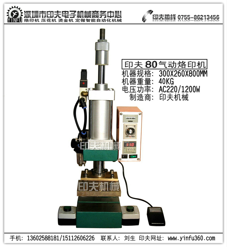 深圳市印夫电子机械设备公司成立于2004年,是一家集技术研发、机械制造、销售维护为一体的综合性企业。公司依托自有的研发中心和深圳生产基地的优势,自2005年开发出国内首台手持式烙印机并投入市场至今,已陆续向市场推出手持式烙印机系列、台式烙印机系列、气动增压烙印机系列、自动滚压烙印机系列、全自动烙印机系列、智能自动化烙印机系列、自动对位烙印机、全自动木叉勺机、木托盘自动生产线、轮胎雕花机、橡胶开槽机、丝印机、数控打码机、自动化检测设备等40多种机型。并可根据客户需求提供专业的非标自动化组装机械开发定制。其产品广泛应用于木材、皮革、塑料、橡胶、纸张等行业。 作为中国首家烙印机专业制造商,印夫公司在烙印机行业的推广应用、技术创新、营销服务方面具备卓越的标杆影响力。 印夫致力于开发定制最可靠的、高效易用的非标自动化组装机械,以最底的总体成本,换来更高的生产效率。公司本着“以诚兴业、以新致胜”的经营理念,助力企业成功,互惠共赢。 印夫公司下设工艺品制造部,本部拥有多台先进的机械加工设备,从业多年的专业技术人员,常年对外承接各种精美的木吊牌、木明信片、木杯垫、木镜、木贺卡、木钥匙扣、木台历、木广告牌、木标牌、木板画、皮标牌等产品的加工业务,量大从优、保质保量,欢迎来电咨询,实地考察。 手机:13602588181/15112606226 电话:0755-86213456/29453500 联系人:刘生