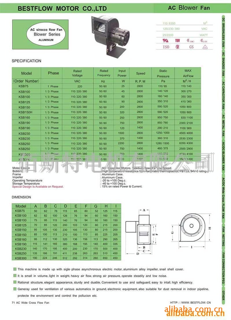 单、三相鼠笼式异步电机与铝合金叶轮、蜗壳组合成整体的离心风机,体积小、重量轻、风量大、风压强、运转平稳、噪音低,可用于地面各种自动装置、电子设备的强迫通风散热,同时可用于室内管道除尘、环境保护和控制污染、干燥、冷暖房送风排气等。共有 75 , 100 , 125 , 150 , 160 , 190 , 230 , 250 , 300 九种规格。风压可达 550Pa ,风量可达 4100m3/h,欢迎新才客户来函来电订购;