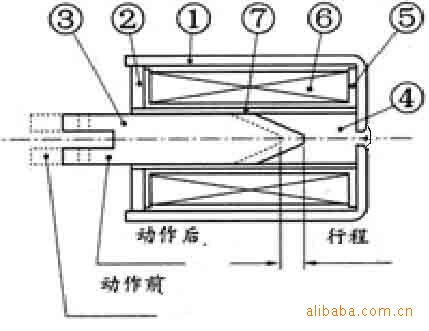 编号 | 名称 | 1 | 外壳 | 2 | 盖板 | 3 | 滑杆 | 4 | 铁芯 | 5 | 骨架 | 6 | 线圈 | 7 | 铜管 |