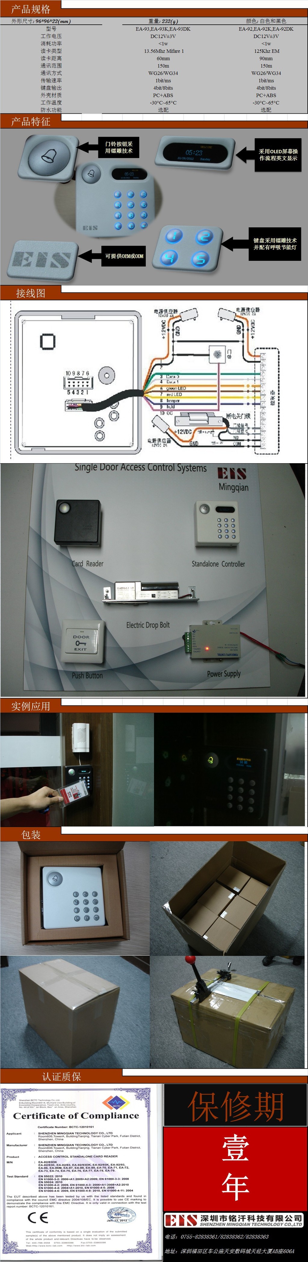 | 读卡类型: EM (ID 卡) | 工作湿度 : 10% ~95% |