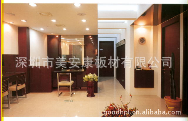 性能卓越:1.防水、防潮、防霉.抗强酸强碱、耐化学腐蚀;2.耐撞击、耐磨、耐刮花抗菌易清洁、抗紫外线;3.防水、耐烟灼绿色环保、无毒无害无异味、防静电、无辐射;4.稳定性强、平整不易变形表面处理丰富、颜色多样。