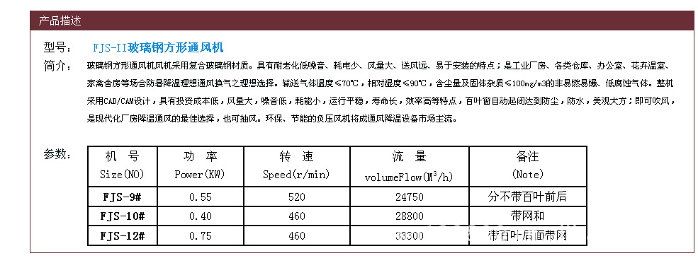 FRP系列风机具有结构简单、安装方便、防腐性能优良,效率高、运转平稳、主要用于厂房、仓库、酸洗工段、化验室、地下室含腐蚀性气体场所通风换气。可输送各种具有易燃晚爆的腐蚀性气体。所输送的气体中硬质颗粒或粉尘含量≤150mg/m3,其温度不得超过-20℃~80℃。