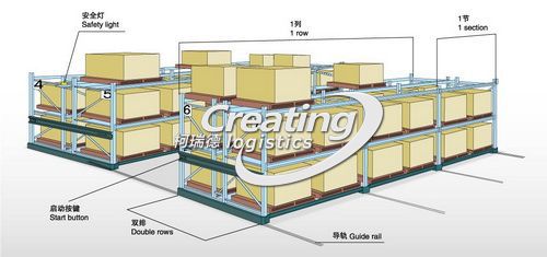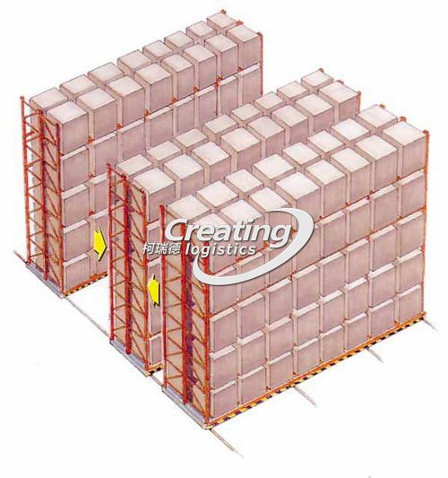 移动式货架可节省通道面积,有普通商品货架和移动式托盘货架两种类型。移动式货架可在地面铺设的轨道上移动,可在较多排架中只留出一条通道。通过货架移动,选择所需通道的位置,叉车在通道内装卸货物。