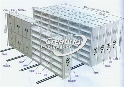 高品质移动式货架移动式货架特点柯瑞德。移动式货架是“可在轨道上移动的货架”。即在货架的底部安装有运行车轮,可在地面上运行的货架。适用于库存品种多,出入库频率较低的仓库;或库存频率较高,但可按巷道顺序出入库的仓库。因为只需要一个作业通道,可大大提高仓库面积的利用率,所以广泛应用于办公室存放文档,图书馆存放档案文献,金融部门存放票据,工厂车间、仓库存放工具、物料等。