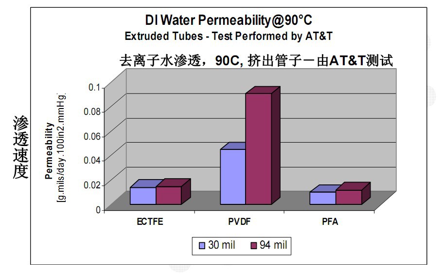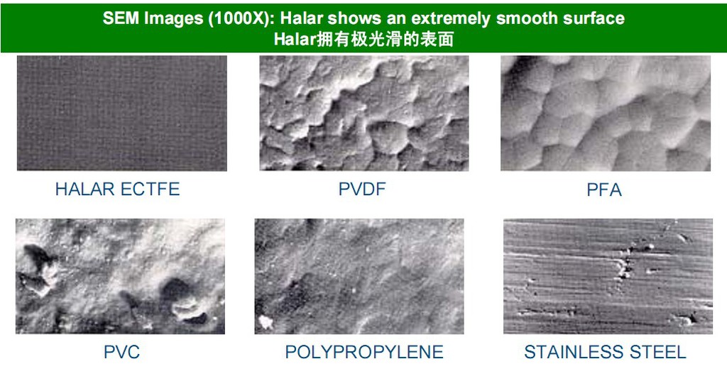 乙烯-三氟氯乙烯共聚物 苏威HALAR®ECTFE(F-30)英文商品名:Halar ECTFE(poly(chlorotrifluoethylene-ethylene))特性简介: HALAR®ECTFE(F-30)是由乙烯与三氟氯乙烯以等摩尔比共聚制得的交替共聚物。具有优良的化学稳定性和不燃性,以及良好的电性能和机械性能,而且可用一般热塑性塑料的成型方法加工。长期使用温度为-50~170℃,热分解温度300℃以上,硬度、表面光滑度、抗渗透性及耐火焰能力较ETFE好。可广泛应用于电子和医药行业无尘无菌风管的内外喷涂,以及化工和其它行业防腐设备和管道的防腐处理。 1、优秀的耐化学系:工业上常用的化学试剂几乎都不能对Halar产生任何影响。Halar能抵抗的化学品包括:强无机酸、强碱、金属刻蚀剂、液氧、除热胺类(如苯胺、二甲胺)以外的所有有机溶剂。 2、更高的硬度:更高的表面硬度提供更好的耐磨性(比如在使用中不断受固体颗粒或盐的沉积和摩擦),更好的耐划伤性(比如在安装过程中避免损坏),这使ECTFE的安全系数更高。在安装和运输过程中,减小意外破坏的可能性,降低保养成本。 3、光滑度:无论是粉末喷涂、挤出成型还是模塑成型的Halar ECTFE表面都特别光滑,这点可由扫描电镜或原子力电镜证明。表面更光滑的优点:减少图层中出现针孔的可能性;抑制固体颗粒和金属盐的堆积和防止堵塞,大大优于PP、PVC或FRP管路;减少生物膜和细菌的形成,这点也可通过生物膜实验结果与电抛光的不锈钢和其他含氟化合物的对比进行证明。 4、耐高低温性:可在此-50℃至150℃之间使用,短时间170℃至180℃也可以使用。 5、抗粘性:几乎所有物质都不能与ECTFE涂层粘合,有着这样稳定的性能,所有在很多方面都有用到它,例如:工业界模具、印染机械等防粘、易脱模、易清洁的性能。 6、耐磨损性:具有低摩擦系数及良好的自润滑性,适用于汽车工业部件、石油钻探行业、以及工业界各行业的自润滑工件。可节约能耗,降低噪音,提高效率。 7、电器绝缘性:具有极佳的绝缘阻抗性能,用于包装机械、纺织业等。 8、优良的抗渗透性:Halar的成功也归功于它出色的抗渗透性(如水蒸气、氧气、酸、氯等),这也使它成为医疗设备、化工行业和半导体行业中的防腐保护材料。 9、防爆、防静电:因为成膜后的涂层有着很强的韧性和拉伸强度,所以是防爆场合理想的选择。因为表面喷涂成膜后形成一种不粘效果,所以表面几乎无法产生静电,广泛用于易燃易爆的场合。 10、阻燃性:与其他热塑性材料不同,当Halar被放置于火焰之上时,不会熔化或滴落,会立刻烧成炭,炭化作用阻止火焰的传播,起到对氧气和热的阻隔作用。 11、超高的纯度:Halar经在超纯水或高纯化学品的静态浸泡测试、动态冲洗数据和超低氟离子析出测试后都表面极低的金属和有机物析出,使Halar ECTFE适用于半导体和生物科技工业的高纯系统中。 12、除了对多种化学品很强的耐性外,E-CTFE还显示出在高温下很强的耐磨性、耐冲击性和韧性,以及完全的真空耐性(例如优良的附着力)等方面优良的抗机械破坏的品质。 HALAR®ECTFE(F-30)现已广泛应用于: 化学加工行业,医药加工行业,半导体加工厂,制浆与造纸工业,水处理,精细化工厂,电厂,强腐蚀环境,超纯化学品存贮和运输,食品工业等。 HALAR®ECTFE(F-30)应用实例包括: 容器、反应器、模具、管道系统、泵、阀、离心机、排风罩、过滤器、碱收集器、电镀装置、涡轮、半导体用化学品存贮罐、无菌无尘通风管路、金属酸浸槽、电镀槽、化工机械、电镀加热管、半导体风管、易燃易爆场合等。 HALAR®ECTFE(F-30)主要性能如下: 粒径:80微米; 比重:1.68 相对密度 | 软化温度 | 连续使用温度 | 耐化学腐蚀 | 洛氏硬度 | 1.68-1.70 | 235-245℃ | -30-170℃ | 优良 | R93 | 伸长率 | 线膨胀系数 | 弯曲强度 | 拉伸强度 | 介电常数 | 200-260% | 8.0×10-5/℃ | 48MPa | 31.4-49.0MPa | 2.6-2.8 |