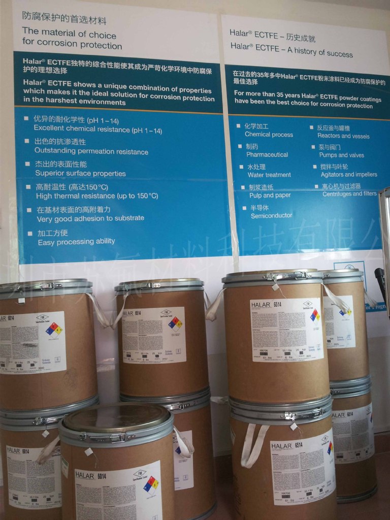 乙烯-三氟氯乙烯共聚物 苏威HALAR®ECTFE(F-30)英文商品名:Halar ECTFE(poly(chlorotrifluoethylene-ethylene))特性简介: HALAR®ECTFE(F-30)是由乙烯与三氟氯乙烯以等摩尔比共聚制得的交替共聚物。具有优良的化学稳定性和不燃性,以及良好的电性能和机械性能,而且可用一般热塑性塑料的成型方法加工。长期使用温度为-50~170℃,热分解温度300℃以上,硬度、表面光滑度、抗渗透性及耐火焰能力较ETFE好。可广泛应用于电子和医药行业无尘无菌风管的内外喷涂,以及化工和其它行业防腐设备和管道的防腐处理。 1、优秀的耐化学系:工业上常用的化学试剂几乎都不能对Halar产生任何影响。Halar能抵抗的化学品包括:强无机酸、强碱、金属刻蚀剂、液氧、除热胺类(如苯胺、二甲胺)以外的所有有机溶剂。 2、更高的硬度:更高的表面硬度提供更好的耐磨性(比如在使用中不断受固体颗粒或盐的沉积和摩擦),更好的耐划伤性(比如在安装过程中避免损坏),这使ECTFE的安全系数更高。在安装和运输过程中,减小意外破坏的可能性,降低保养成本。 3、光滑度:无论是粉末喷涂、挤出成型还是模塑成型的Halar ECTFE表面都特别光滑,这点可由扫描电镜或原子力电镜证明。表面更光滑的优点:减少图层中出现针孔的可能性;抑制固体颗粒和金属盐的堆积和防止堵塞,大大优于PP、PVC或FRP管路;减少生物膜和细菌的形成,这点也可通过生物膜实验结果与电抛光的不锈钢和其他含氟化合物的对比进行证明。 4、耐高低温性:可在此-50℃至150℃之间使用,短时间170℃至180℃也可以使用。 5、抗粘性:几乎所有物质都不能与ECTFE涂层粘合,有着这样稳定的性能,所有在很多方面都有用到它,例如:工业界模具、印染机械等防粘、易脱模、易清洁的性能。 6、耐磨损性:具有低摩擦系数及良好的自润滑性,适用于汽车工业部件、石油钻探行业、以及工业界各行业的自润滑工件。可节约能耗,降低噪音,提高效率。 7、电器绝缘性:具有极佳的绝缘阻抗性能,用于包装机械、纺织业等。 8、优良的抗渗透性:Halar的成功也归功于它出色的抗渗透性(如水蒸气、氧气、酸、氯等),这也使它成为医疗设备、化工行业和半导体行业中的防腐保护材料。 9、防爆、防静电:因为成膜后的涂层有着很强的韧性和拉伸强度,所以是防爆场合理想的选择。因为表面喷涂成膜后形成一种不粘效果,所以表面几乎无法产生静电,广泛用于易燃易爆的场合。 10、阻燃性:与其他热塑性材料不同,当Halar被放置于火焰之上时,不会熔化或滴落,会立刻烧成炭,炭化作用阻止火焰的传播,起到对氧气和热的阻隔作用。 11、超高的纯度:Halar经在超纯水或高纯化学品的静态浸泡测试、动态冲洗数据和超低氟离子析出测试后都表面极低的金属和有机物析出,使Halar ECTFE适用于半导体和生物科技工业的高纯系统中。 12、除了对多种化学品很强的耐性外,E-CTFE还显示出在高温下很强的耐磨性、耐冲击性和韧性,以及完全的真空耐性(例如优良的附着力)等方面优良的抗机械破坏的品质。 HALAR®ECTFE(F-30)现已广泛应用于: 化学加工行业,医药加工行业,半导体加工厂,制浆与造纸工业,水处理,精细化工厂,电厂,强腐蚀环境,超纯化学品存贮和运输,食品工业等。 HALAR®ECTFE(F-30)应用实例包括: 容器、反应器、模具、管道系统、泵、阀、离心机、排风罩、过滤器、碱收集器、电镀装置、涡轮、半导体用化学品存贮罐、无菌无尘通风管路、金属酸浸槽、电镀槽、化工机械、电镀加热管、半导体风管、易燃易爆场合等。 HALAR®ECTFE(F-30)主要性能如下: 粒径:80微米; 比重:1.68 相对密度 | 软化温度 | 连续使用温度 | 耐化学腐蚀 | 洛氏硬度 | 1.68-1.70 | 235-245℃ | -30-170℃ | 优良 | R93 | 伸长率 | 线膨胀系数 | 弯曲强度 | 拉伸强度 | 介电常数 | 200-260% | 8.0×10-5/℃ | 48MPa | 31.4-49.0MPa | 2.6-2.8 |