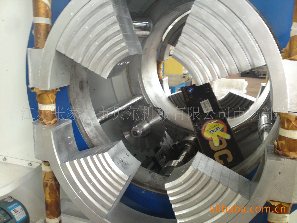 产品描述: 本公司生产的PE、PP给水、燃气管道生产线具有多年的生产经验,管径最小可以从20mm做起,最大可以做到1200mm,该机组由本公司生产的高效单螺杆挤出机、挤出模头、真空定型箱、喷淋箱、牵引机、切割机、翻料架等组成。该机组的挤出机采用进口直流调速器调速,牵引机采用进口交流变频调速装置,真空泵和牵引电机均采用优质电机产品。牵引有二爪、三爪、四爪、六爪、八爪、十爪、十二爪等牵引方式,可根据不同管径采用不同爪数的牵引。切割可选用锯片式或行星式另可带计长及增厚装置。机组性能可靠、生产效率高。 挤出机螺杆使用屏障段和混合段,机筒拥有新型沟槽。所有这些新型设计是为了增加塑化和混练效果。特殊设计的HDPE(PP,ABS) 篮式膜具,使溶解温度更低,拥有好的混合效果,低的机头压力,并有好的稳定产量。 采用特殊设计的冷却和定径系统,使用水循环冷却HDPE(PP,ABS) 原料,适合以上原料的冷却。特殊设计可以拥有稳定的直径尺寸和圆整度,可以适合生产厚壁管的需要。 特殊设计的真空定径箱,可以确保稳定的直径尺寸和圆整度,使用速度控制系统,使牵引速度稳定。 整条生产线采用PLC控制,液晶屏幕控制面板,是操作简易方便。可以增加色标挤出机,使生产的管材拥有色标线。 产品介绍: 1.配合单螺杆挤出机,适合PE 树脂的挤出,产量高,最高产量1000公斤每小时。 2.本生产线采用合理的设计,采用安全生产设计,获得CE 安全认证。 3. PE管材直径范围16mm-800mm , 可以换算成英寸制,符合客户的特殊要求。 技术参数 管径范围 | 16-63mm | 20-110mm | 75-160mm | 90-250mm | 110-315mm | 160-450mm | 315-630mm | 500-800mm | 挤出机 | SJ45 | SJ65 | SJ75 | SJ75 | SJ90 | SJ90 | SJ120 | SJ150 | 主机功率 | AC30kw | DC75kw | DC110kw | DC110kw | DC160kw | DC160kw | DC280kw | DC335kw | 挤出产量 | 60-100kg | 100-150kg | 250-300kg | 250-300kg | 350-400kg | 350-400kg | 650-700kg | 850-900kg | 最大生产速度 | 10m/min | 6m/min | 6 m/min | 6 m/min | 3 m/min | 1.2m/min | 0.9m/min | 0.7m/min |