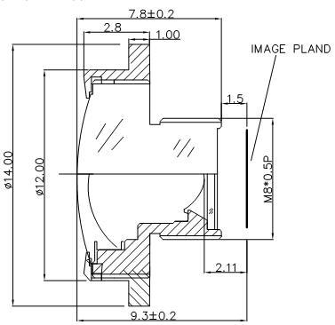 芯片尺寸sensor size:1/4"&1/3.6",焦距f:0.9mm,光圈F/N:2.8,光学总长:9.3mm,螺牙THREAD SIZE:M8*P0.5,角度FOV:对角/D/170度,水平/H/120度,垂直/V/90度, 变形量DISTORTION:<8%, 构成CONSTRUCTION:2G2P+IR650