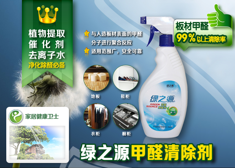 绿之源甲醛清除剂适用未经饰面或未刷油漆的裸露人造板表面,通过涂刷或喷涂,使药液渗透至人造板内部与板材内部尿醛树脂胶释放的甲醛分子进行高分子聚合反应,生成高分子聚合树脂,生成物稳定性极强,不会因外部因素变化而出现逆变,具有高除醛率不反弹的产品优势