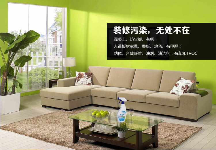 将沙发掀起,把沙发下面的底布从一边撕开查看内部框架是否为人造板材,如是则使用 喷枪将绿之源甲醛清除剂对内部板材进行喷涂处理,喷涂2-3遍为宜,每遍间隔 10 -15 分钟。如布艺沙发则使用绿之源异味清除触媒进行喷涂处理,喷涂量每平米10-15毫升。 如为皮质沙发,而且皮革味道较大,可使用绿之源皮革除味养护精华剂对皮革表面进行 处理,处理方法为:使用塑料喷壶将皮革除味剂按每平米15-20毫升均匀喷洒在皮革表 面,然后使用软布轻轻擦拭均匀即可。
