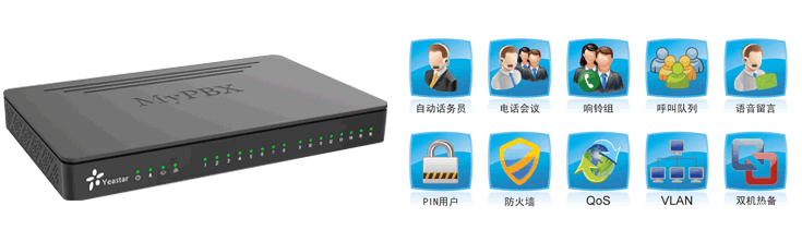 | 自动话务员 呼叫队列 响铃组 话机自动配置 黑名单 通话记录 呼叫转移 呼叫停泊 呼叫截答 呼叫路由 呼叫等待 呼叫跟随 通话录音 (一键录音) 来电显示 电话会议 外转外(DISA) 特色铃声 免打扰(DND) 防火墙 广播/对讲 等待音乐 PIN用户 (PIN码控制) 结合Skype (Skype Connect) 三方通话 语音留言 传真(T.38) 监听 静态路由 按名字拨号 移动分机 速拨码 支持VPN(OpenVPN) 多国语言系统提示音 短信功能 *TR069