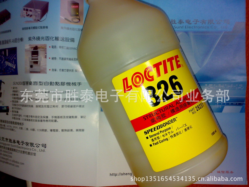 | loctite326快速固化,乐泰胶水326 用于粘接刚性材料,如将铁氧体粘到电机的电镀金属件或扬声器零件上,也适于粘接金属和玻璃,配用促进剂7649。它是一种高强度多用途粘接剂,一种能提供环氧树脂的强度以及瞬干胶的固化速度的结构胶。耐溶剂性好。在几分钟内固化。适合要求快速固定的条件。 包装:50ml、1L 典颜色:透明、淡琥珀色至黄色