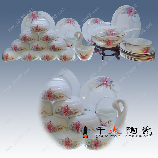 景德镇陶瓷厂生产餐具,陶瓷餐具,批发餐具,套装陶瓷餐具,高档礼品陶瓷餐具。公司著名品牌——千火陶瓷主营公司最新产品。餐具画面众多,精品餐具适合商务礼品的馈赠,公司福利礼品的发放。景德镇餐具主要有釉中骨质瓷餐具、釉上骨质瓷餐具、青花瓷餐具、青花玲珑餐具(又称“米通”餐具)、玉瓷餐具(又称“高白瓷”餐具,更有多种类的零散餐具。餐具主要以套装为主。其中56头餐具和38头餐具居多。餐具套装说明: