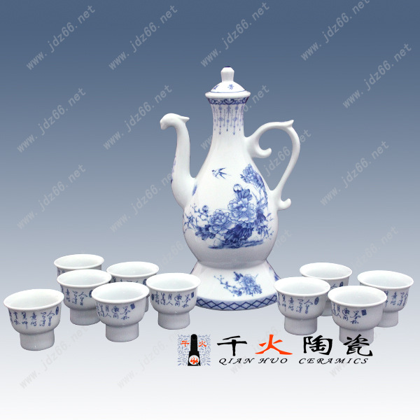 该产品是景德镇的最新专利产品,不用手工斟酒而是有电子感应的只要把酒杯放在托盘上壶中的酒就会自动喷出来,直到酒满为止.是居家陈设和馈赠友人的佳品。