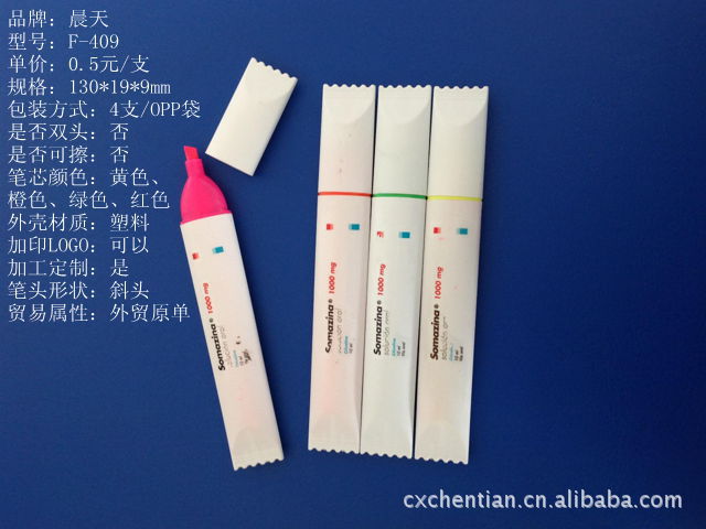 F-409-4荧光笔,是我司的一款新型高亮笔,墨水符合ASTM D-4236及EN-71认证,品质优良,同时提供黑杆,0.4元/支,欢迎您的询问。