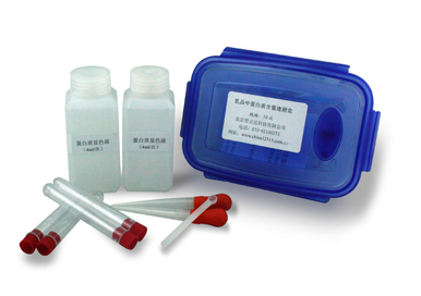 1. 奶粉蛋白质含量测定用盒内小勺取奶粉一平勺加入到比色管中,取 4ml 显色液加入比色管中,盖上盖,用力将奶粉全部摇溶,显色 3 分钟,在 3 - 5 分钟内将比色管衬在白纸上与标准比色卡进行对比,找出与乳粉蛋白质标准比色卡上相近的色阶,即为每 100g 乳粉样品中蛋白质的含量。