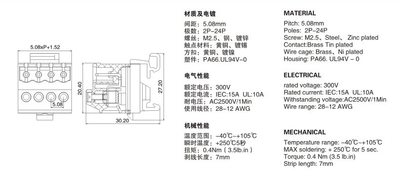 间距:5.08mm;极数:2P-24P;额定电压/电流:300V/IEC:15A UL:10A