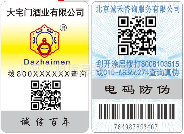 防伪查询方式:企业产品防伪技术应用支持,主要防伪技术有“800免费查询、400手机查询、9510特服号码查询、网站查询、查询及普通电话查询等多媒体防伪标贴。
