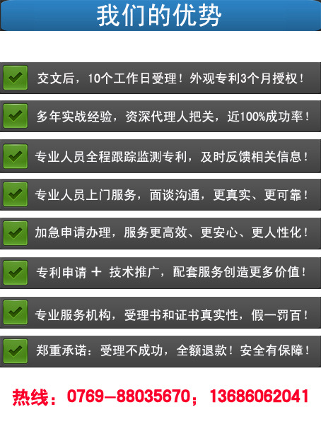 东莞华诚知识产权郑重承诺:专利受理书不能顺利下发,退还全部代理费用!信心来自我们的专业,信心来自我们的实力!我们的服务有保障!