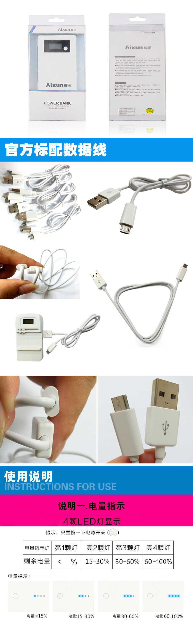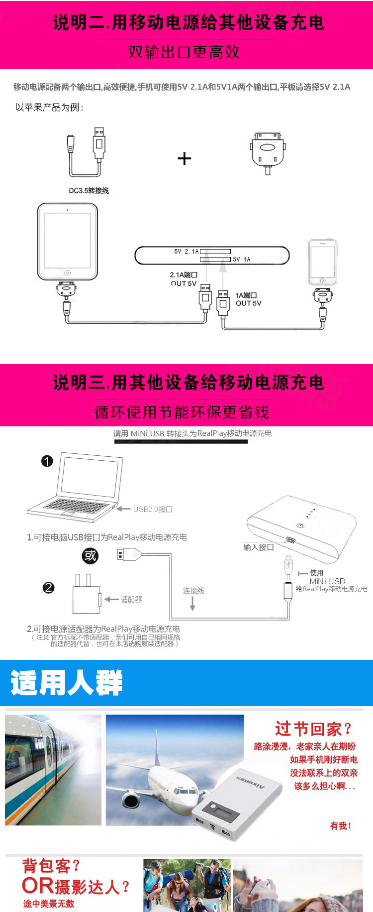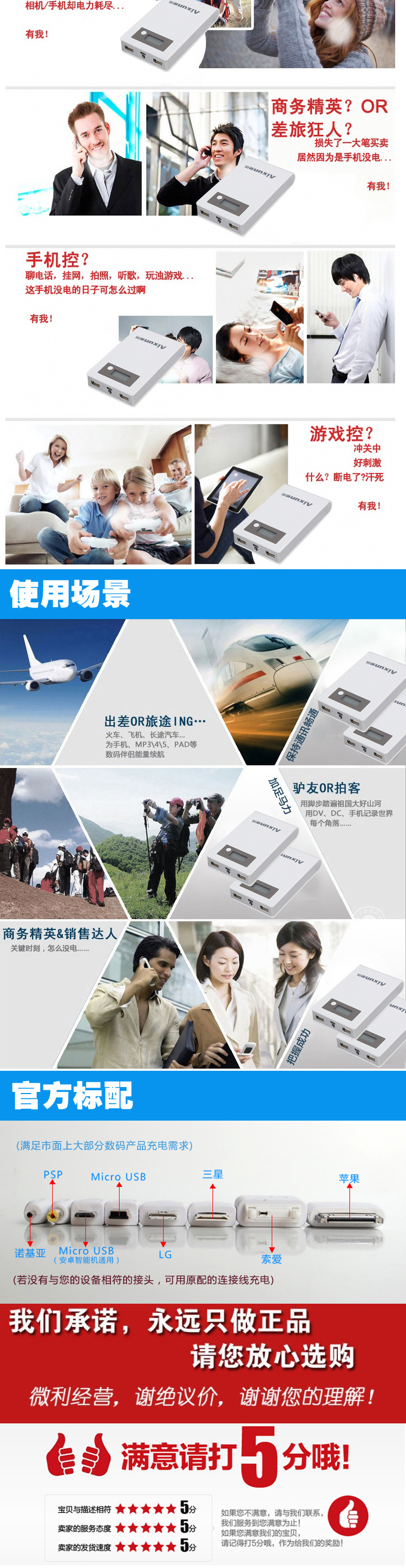 功能:一机多能、省钱省时、为市场各种品牌的手机、IPOD、MP3、MP4、IPHONE、GPS、蓝牙数码相机等多种 便携式数码产品供电或充电。