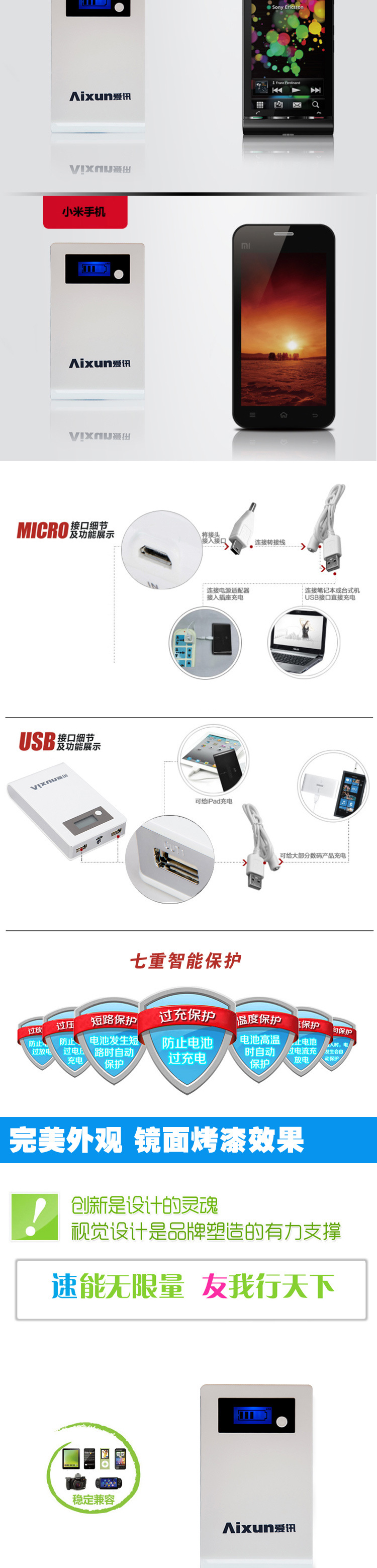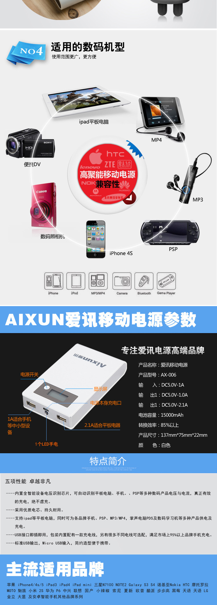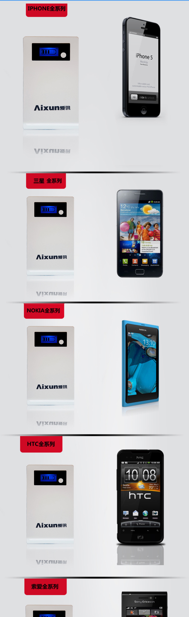 功能:一机多能、省钱省时、为市场各种品牌的手机、IPOD、MP3、MP4、IPHONE、GPS、蓝牙数码相机等多种 便携式数码产品供电或充电。