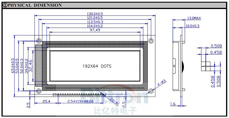 技术参数【产品型号】:BYT19264A 【点 阵 数】:192×64 【外型尺寸】:130.0×65.0×13.0 【视域尺寸】:104.0×39.0 【点 大 小】:0.458×0.458 【点 间 距】:0.508×0.508 【显示模式】:STN(黄绿、蓝、灰)模式,FSTN黑白模式 【显示视角】:6:00视角 【控制芯片】:KS0107及其兼容 【工作电压】:+5V / +3.3V 【工作温度】:-20℃~70℃ 【储存温度】:-30℃~80℃ |