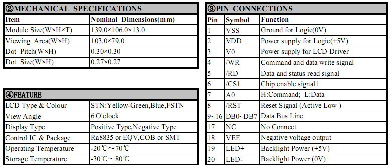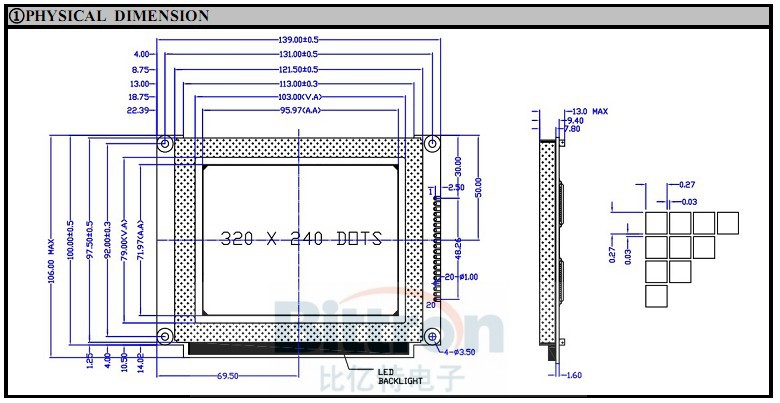 【产品型号】:BYT320240B 【点 阵 数】:320×240 【外型尺寸】:139.0×114.0×12.0 【视域尺寸】:103.0×79.0 【点 大 小】:0.27×0.27 【点 间 距】:0.30×0.30 【显示模式】:STN(黄绿、蓝、灰)模式,FSTN黑白模式 【显示视角】:6:00视角 【控制芯片】:RA8835及其兼容 【工作电压】:+5V / +3.3V 【工作温度】:-20℃~70℃ 【储存温度】:-30℃~80℃ |