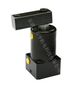 转角缸工作过程,活塞先行完成旋转行程——压臂下压并旋转至设计的规定位置和角度,然后完成夹持行程——即直线下压并夹紧工件。装夹工件前压臂离开工件。工件装好后,通过换向伐控制压臂旋转到工件上方,再垂直向下直线运动将工件压紧;释放工件时,压臂自动按压紧的路线返回到原来的位置让开工件,操作者就可以顺利方便的卸下工件。