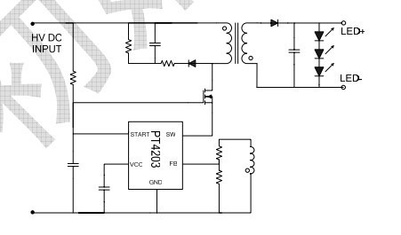 PT4203采用变压器初级侧感应恒流控制技术,无需外围反馈环路,系统方案简洁可靠。优化设计的电流补偿功能保证在85VAC~265VAC输入电压范围负载电流保持恒定,电感补偿功能保证LED负载电流不随变压器绕组电感变化。集成的多种保护功能可处理各种系统故障,包括:逐周期过流保护,负载短路,负载开路,反馈通路开路及内部过温关断。