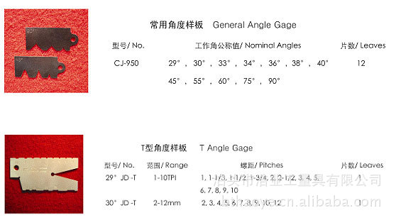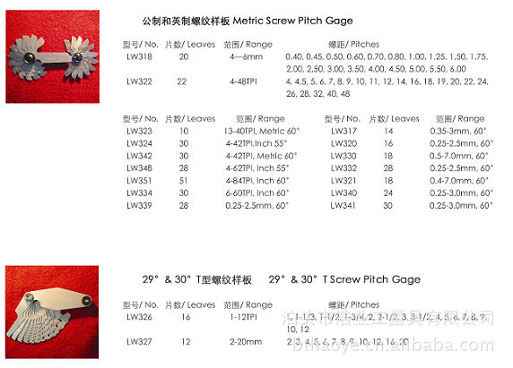 1.)29度T型螺纹规又名美制梯形螺纹样板,16片为一组,每片按照每英寸多少牙数来表示,牙数1mm-12mm,具体牙数为1, 1-1/3, 1-1/2, 1-3/4, 2, 2-1/2, 3, 3-1/2, 4, 5, 6, 7, 8, 9, 10, 12mm