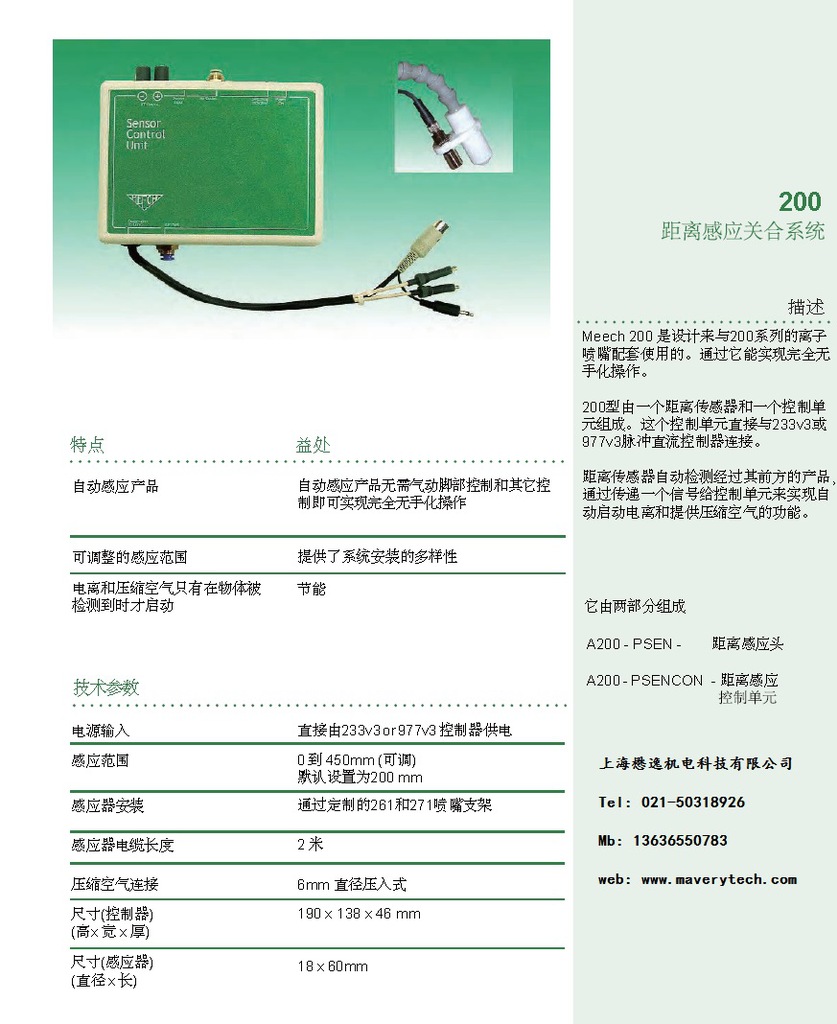 200感应控制器被广泛用于自动化流水线上, 系统通过密其233v3 或者977v3直流控制器提供电源, 然后通过与本系统相连的静电发生头和空气喷嘴为流水线上的产品提供静电中和及除尘功能。系统只有在感应到前方有产品时才会自动启动, 从而达到自动控制和节能的目的。