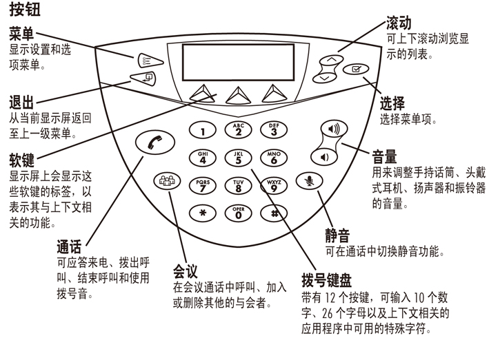 电话簿开/关键、会议键、静音键、音量键增大/降低、菜单键、引导键3个功能键,包括:重拨键、保持键、会议编程键