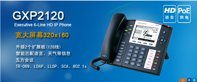GXP2120可以同时注册6个SIP账号、支持6条线路通讯。宽大的320x160图形化灰度LCD背光显示屏,4个可编辑XML 应用程序软按键以及7个XML可编辑BLF多功能键。自动化的个人多媒体信息服务,支持5方会议功能。GXP2120 还支持多种语音编码,两个支持PoE供电的10/100 Mbps 自适应交换式以太网接口,耳麦接口,AES安全配置文件规范的批量配置功能。自动化配置,快速简便的安装。广泛兼容其它第三方SIP设备及主要 SIP/NGN/IMS平台。GXP2120是一款具备高级功能及扩展应用的管理级话机。