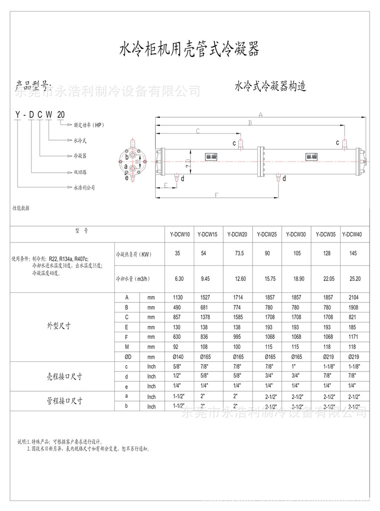 产品技术性能特点 本公司生产的制冷用壳管式换热器,从选择换热管性能,通径大小,结构形式,排列方式,到确定管箱组合形式,以及采用新的密封材料和密封方法,进行了多方面优化设计,综合技术性能处于国内先进水平。1、经过精确的匹配校核,换热计算,综合优化设计,换热效率高。2、采用密排和强化技术,体积小,换热面积大,换热性能好。3、换热管选用优质高效强化铜管,换热管与管板联接采用纯机械胀接,质量可靠。4、采用高性能、长寿命密封材料和高强度密封结构,密封性好。