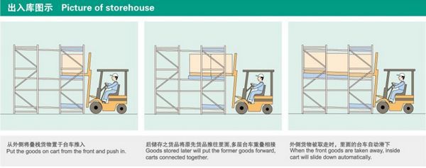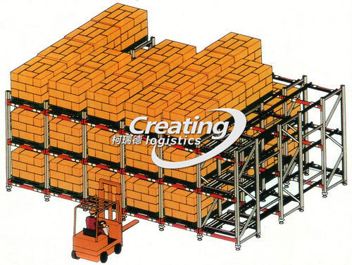 推入式货架又称压入式货架 后推式货架 小车货架。它采用轨道和托盘小车相结合的原理,轨道呈一定的坡度,利用货物的自重,托盘货物被规定于单端存储,货物先进后出,适用于大批量少品种的货物存储,空间利用率很高,存取也较灵活方便。
