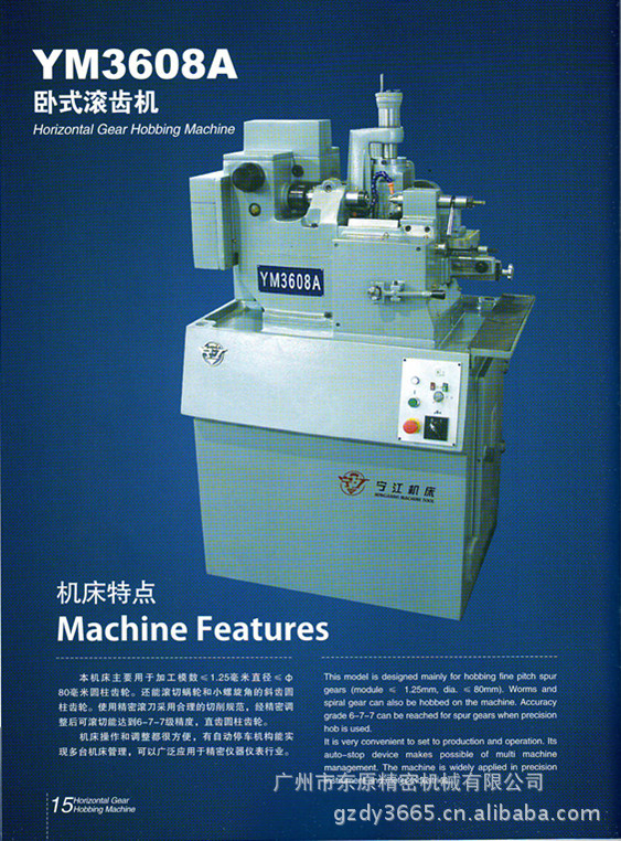机床主要用途、适用范围: 1.1 主要用途 1.1.1 YM3608A 精密卧式滚齿机主要用于加工精度较高的小模数直齿圆柱齿轮、小角度斜齿圆柱齿轮及蜗轮。 1.1.2 使用高精度滚刀、采用合理的切削规范时,可加工 6-7-7 级精度[GB/T2363-1990(模数小于1mm)或GB/T10095-1988(模数大于、等于1mm)]的直齿圆柱齿轮,表面粗糙度Ra为3.2μm 。 1.1.3 使用高精度滚刀、采用合理的切削规范时,可加工 7 级精度[GB/T2363-1990(法向模数小于1mm)或GB/T10095-1988(法向模数大于、等于1mm)]的斜齿圆柱齿轮,表面粗糙度Ra为3.2μm 。 1.1.4 采用径向法加工蜗轮,使用高精度滚刀、 采用合理的切削规范时,可达到与直齿圆柱齿轮相当的精度。 1.2 适用范围 1.2.1本机床通过各种交换挂轮的组合,可加工的齿数范围为6~390齿,滚刀架转动角度为±20°。 1.2.2本机床操作简单、调整方便, 可实现多台机床的管理。本机床可广泛用于摩托车、仪器、仪表、玩具、 电动渔具等行业的各种不同精度的小模数齿轮的成批、大量加工。  |