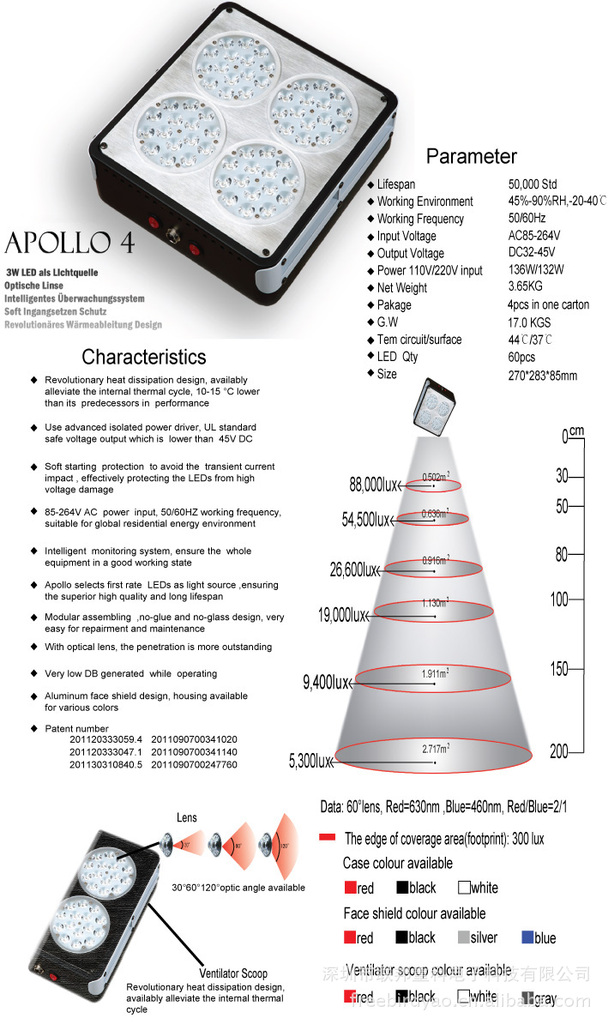 10.不同光之间的比例可由客户指定,我们建议的比例是(红:蓝)2:1, ,红.蓝.橙.白.黄混合光提供给植物.