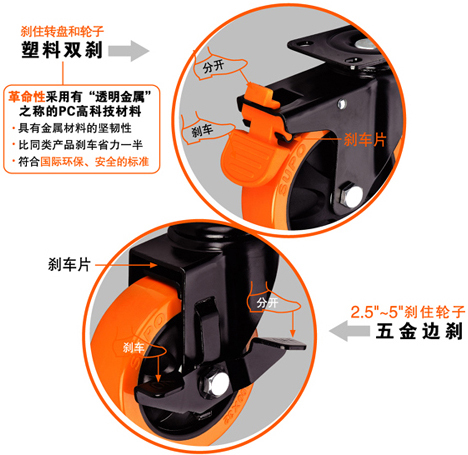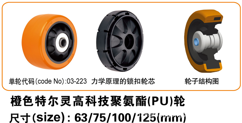 轮子:轮面采用进口A级聚氨酯材料,极具耐磨;轮芯采用全新设计的锁扣原理,使轮面和轮芯更吻合;特尔灵的结构,具有防水、防潮湿、耐腐蚀功能。
