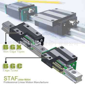 STAF直线导轨简介: STAF直线导轨是一种滚动导引,它由钢珠在滑块与滑轨之间作无限滚动循环,使得负载平台能沿着滑轨轻易的以高精度作线性运动,其摩擦系数可降至传统滑动导引的1/50,使之能轻易地达到μm级的定位精度。滑块与滑轨间的末制单元设计,使得线形滑轨可同时承受上下左右等各方向的负荷,专利的回流系统及精简化的结构设计让STAF的线性滑轨有更平顺且低噪音的运动。 BGX四排珠高刚性等负载设计: 四排珠之设计钢珠于滑块与滑轨之间成4点45度角接触,可平衡抵消来自各方向滑块所受的力,不论滑轨呈任何角度装置,各方向之负载能力皆相等,广泛应用各类型机械器采用,相较于哥德式二排高计,四排珠有着较高刚性、精度及寿命之优势,尤其X型之四排珠设计拥有自动调心能力,即使装配轨道基准面产生很大的偏差或组合出现误差,都能被系统自身消除掉,因而可获得轻快精准的直线运动。 优点为:1、运动轻快; 2、低摩擦阻力; 3、额定负载大; 4、产品稳定性高。 BGX防尘系统之设计: 异物进入通常为降低滑轨寿命方因,因为线性滑轨精密度主要依赖滑轨、滑座与钢珠循环精密度维持,再小的异物进入循环都会造成线轨跳动、顿点甚至永久性破坏,所以防止尘埃进入,都是提升滑轨品质重点,BGX之防尘系统针对异物进入方式,可将尘埃区分为上防尘与下防尘系统。针对滑轨沉头孔与滑轨滑座之间隙作防尘之保护。 BGX循环系统创造了许多容油空间,使润滑油拥有更多的空间容纳,不易完全流散,线性滑轨移动产生惯性会带动整体的润滑油散布整个金属结构,使整体使用寿命更加稳定。而线性滑轨静止之后,润滑油流散金属表面也会回到BGX循环系统的容由空间。持续保护使用寿命。 BGC适用于高速运作: 传统型线轨设计上,钢珠于滑轨与滑座之间相互旋转。钢珠点上相对速度为彼此转速之两倍。加上传统型线轨为钢珠与钢珠为点接触。接触面积A非常小。所以接触压力(P)接近于无限大(P=钢珠互相推挤力(F)/接触面积A)。所以传统型线轨之钢珠容易彼此磨损。而BGC系列为钢珠与钢珠中间含油膜。所产生之摩擦力为油膜吸收,使用速度上可高速使用。 BGC系列钢珠为球保持器含油膜接触,并非钢珠与钢珠相互旋转接触,相对摩擦速度传统型为BGC型线性滑轨两倍,传统型钢珠为点接触,BGC线性滑轨为油膜接触,故传统型接触压力远超过BGC线轨,所以综合上述原因,BGC线性滑轨摩擦速度与压力远低于传统线性滑轨,所以比较发热状况,BGC线轨发热低于传统型线轨。 特点: 1、容许负荷大; 2、所有方向皆具备有高刚性 ; 3、润滑构造简单; 4、自动调心能力; 5、具有互换性 。 STAF金属端盖式线性滑轨 特性: 耐热、耐冷性极佳,使用环境温度可达150°C 用途:焊接机器,半导体设备,玻璃生产设备 STAF高防尘刮屑线性滑轨 特性:抗粉尘,长时间维持良好刮屑能力,安装容易,延长线性滑轨使用寿命 用途:木工机,雕刻机,工具机,产业机器设备。